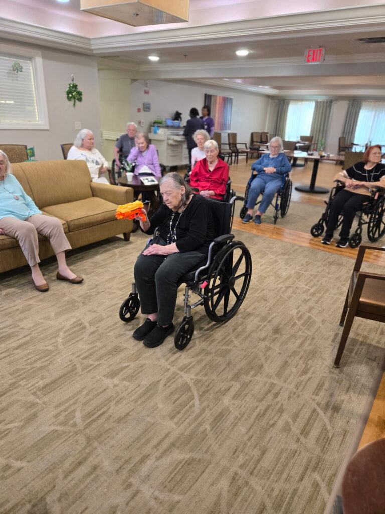 Residents at Presbyterian Village North Assisted Living took aim with Nerf guns to sharpen their dexterity and hand-eye coordination while having a blast.