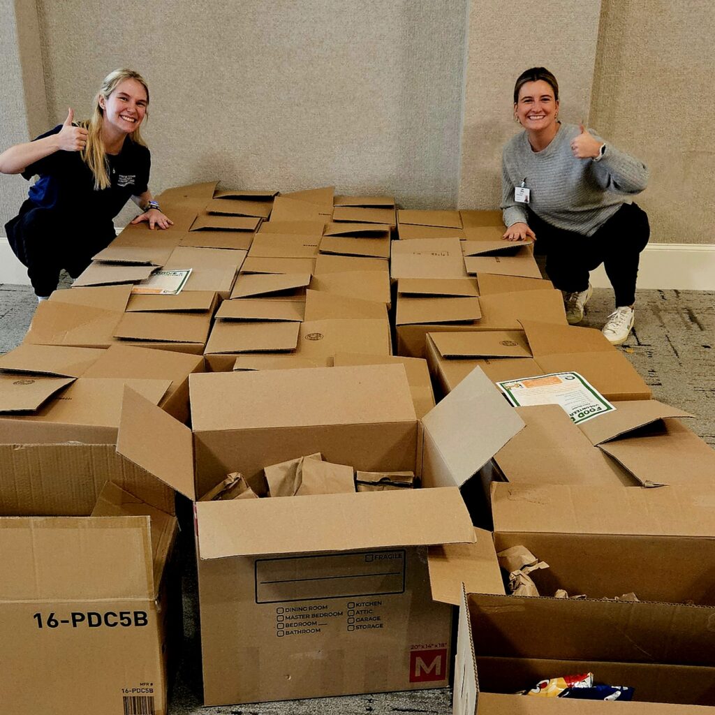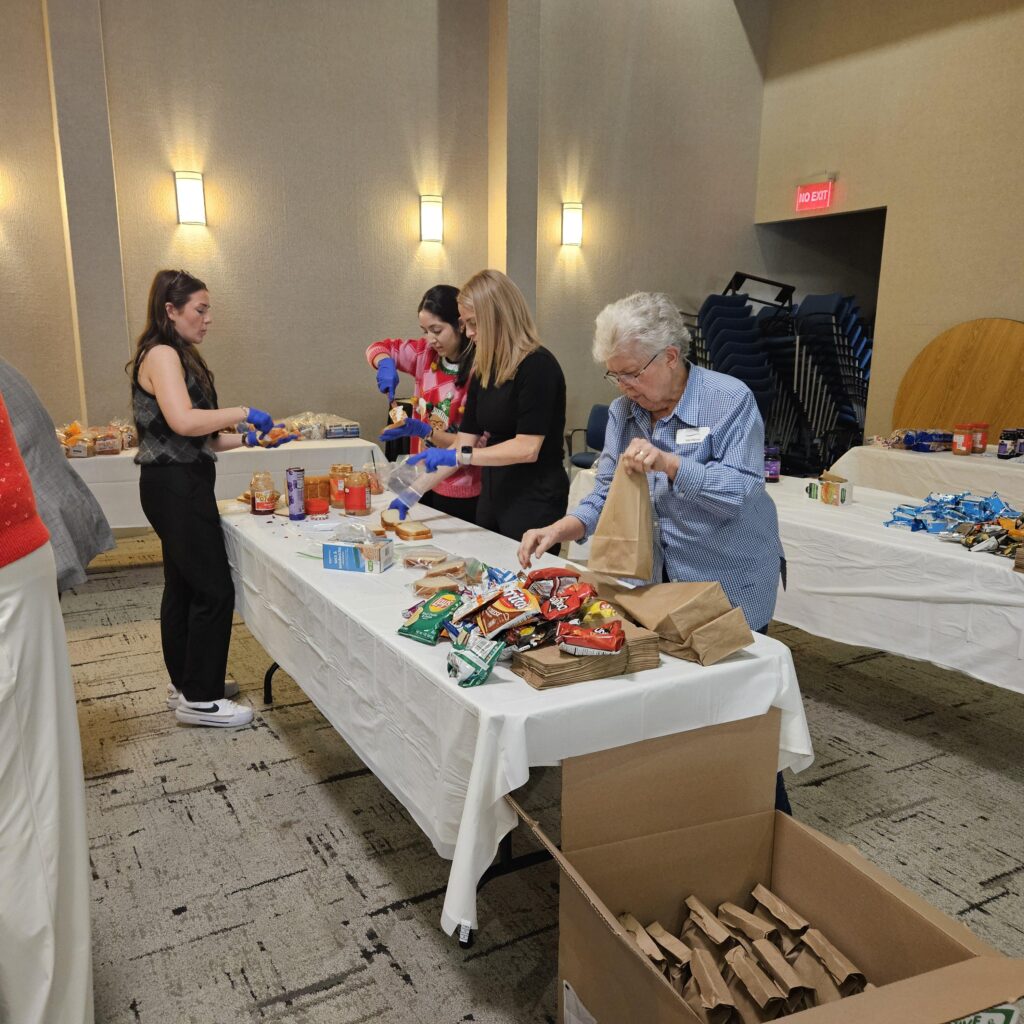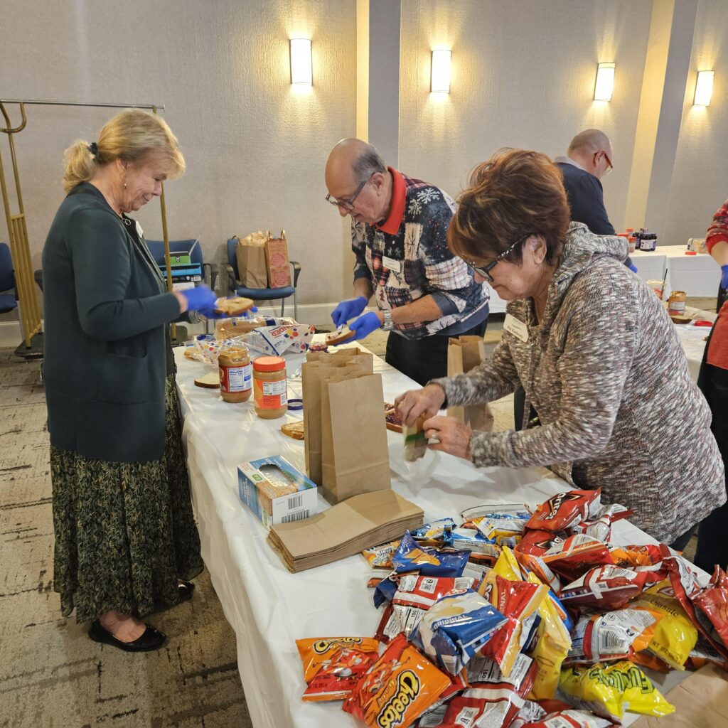 When packing day arrived the auditorium buzzed with activity. Tables filled quickly as residents and teammates took their places working side by side to assemble lunches. Music set an upbeat tone and friendly competition kept the momentum going as teams worked to out-pack one another. By the end of the event more than 600 meals were ready to be shared.